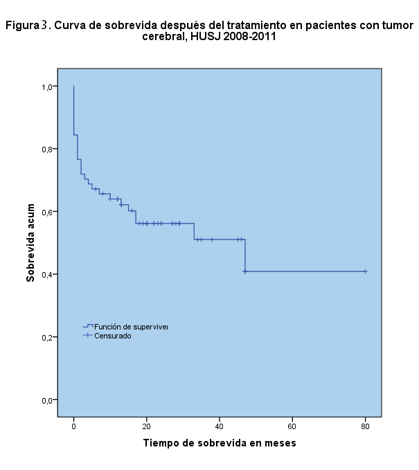 Objetivo: determinar las características demográficas, frecuencia, métodos diagnósticos, mortalidad, supervivencia, y tratamiento de pacientes con tumores cerebrales en el Hospital Universitario San Jorge de Pereira, Risaralda, Colombia. Materiales y métodos: Se realizó un estudio descriptivo retrospectivo, en el cual se tuvo en cuenta 78 historias clínicas de pacientes que ingresaron al Hospital Universitario San Jorge entre los años 2008-2011, con diagnóstico de tumor cerebral, de ellas se analizaron y compararon con estudios nacionales e internacionales datos demográficos, clasificación del tumor según la Organización Mundial de la Salud (OMS), método diagnóstico, hallazgos positivos en la Tomografía Axial Computarizada simple y contrastada, Imagen por Resonancia Magnética Cerebral y biopsia, localización del tumor, tratamiento recibido (cirugía, quimioterapia y radioterapia), sobrevida y funcionalidad del paciente mediante la escala de Karnofsky. Resultados: De los 78 pacientes el 62,8% eran hombres, la edad promedio fue 45,9 años, con una moda de 35, los tumores más frecuentes fueron el glioblastoma multiforme y el tumor metastásico (17,9% cada uno), el tratamiento de elección fue la cirugía (80,8%), seguido de la radioterapia (29,5%) y la quimioterapia (17,9%). La mortalidad fue del 45% con una sobrevida de 3,4 años (DE 1,2). El 51% de los pacientes que ingresaron con Karnofsky menor de 70 murieron. Discusión: La supervivencia de los tumores cerebrales en el Hospital Universitario San Jorge es mayor a la esperada por la OMS, la cirugía fue el tratamiento de elección junto a tratamiento complementario con radioterapia y quimioterapia, incrementando la sobrevida; la Tomografía Axial Computarizada se usó en todos los pacientes por su disponibilidad, precisión y costo-efectividad para este medio, la biopsia es una herramienta necesaria para el diagnóstico definitivo del tipo de tumor y la escala funcional de Karnofsky se podría utilizar como factor pronóstico de mortalidad en tumores cerebrales.Descargas