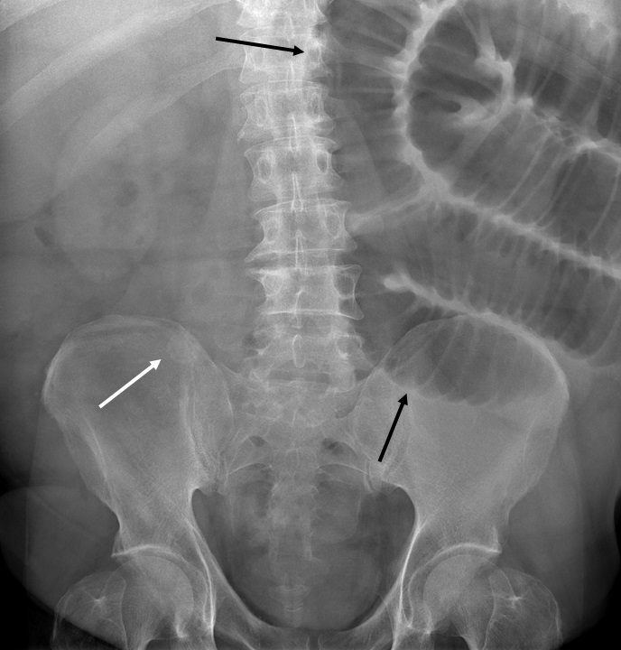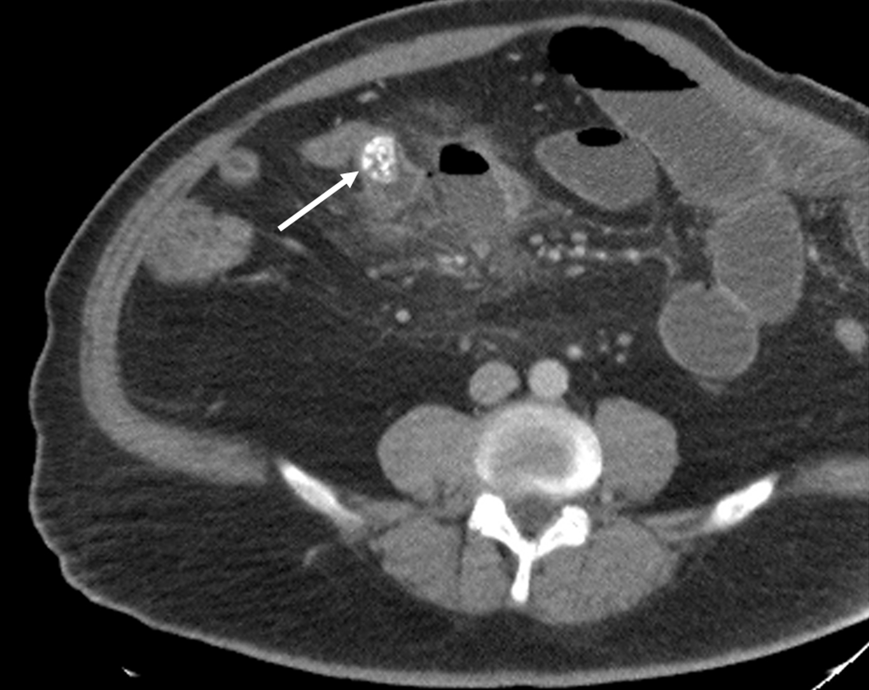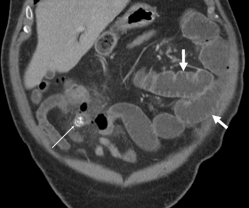 Mediante pruebas de imagen se diagnosticó una obstrucción intestinal secundaria a diverticulitis de Meckel por un enterolito, se realizó intervención quirúrgica y se confirmaron los hallazgos radiológicos descritos.